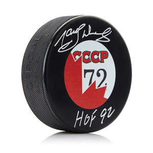 Gerry Cheevers Signed Team Canada Canada Cup Hockey Puck with HOF NoteGerry Cheevers Signed Team Canada Canada Cup Hockey Puck with HOF Note