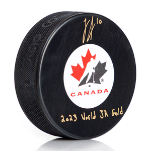 Logan Stankoven Signed Team Canada Hockey Puck with Jr Gold NoteLogan Stankoven Signed Team Canada Hockey Puck with Jr Gold Note
