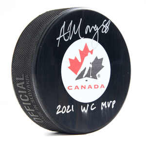 Andrew Mangiapane Signed Team Canada Hockey Puck with 2021 WC MVP NoteAndrew Mangiapane Signed Team Canada Hockey Puck with 2021 WC MVP Note