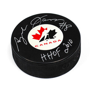 Lanny McDonald Signed Team Canada Hockey Puck with HOF NoteLanny McDonald Signed Team Canada Hockey Puck with HOF Note