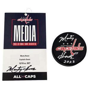 Marty Howe Autographed & Used 2023 Washington Capitals Media Pass & Bottle Opener PuckMarty Howe Autographed & Used 2023 Washington Capitals Media Pass &...